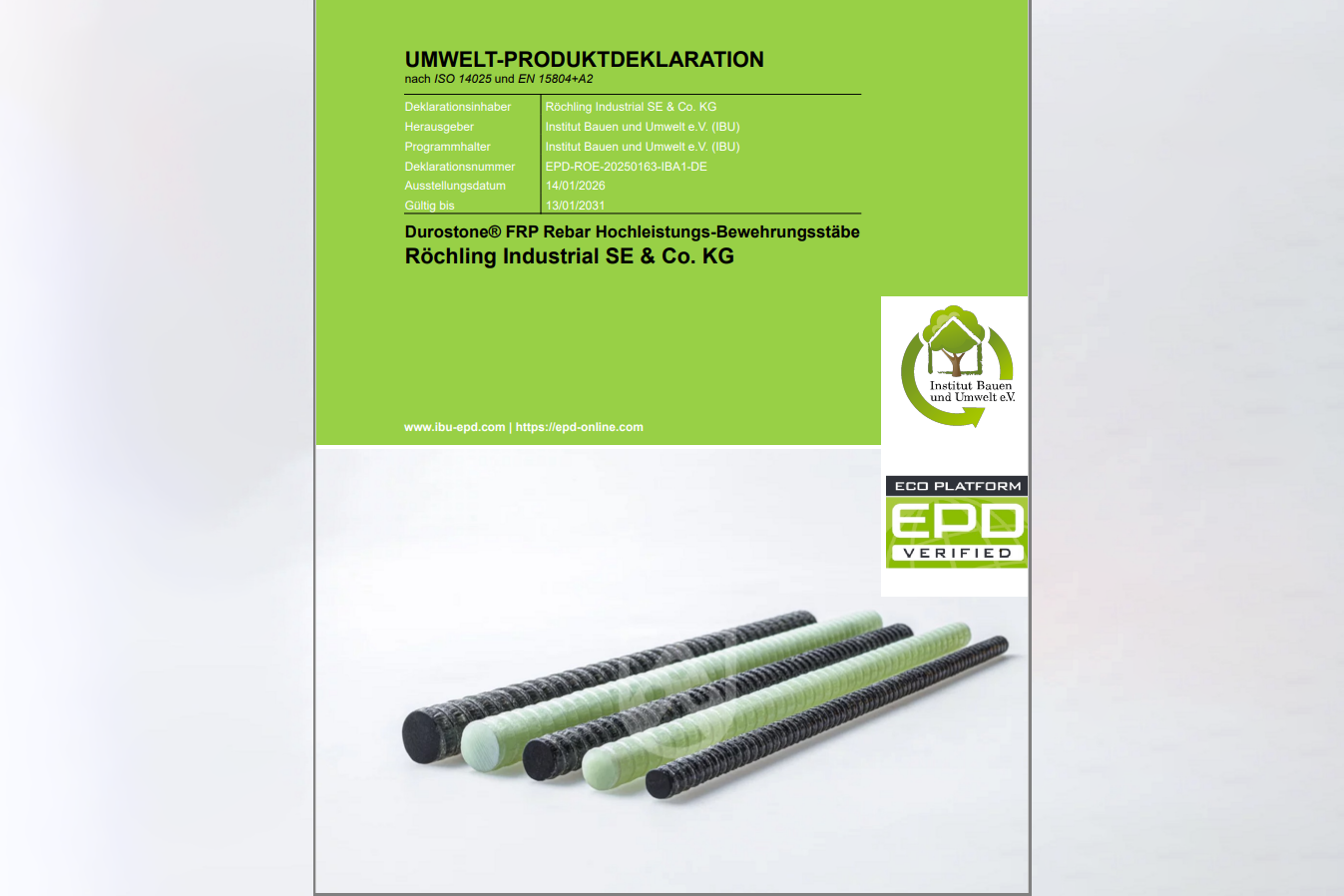 A verified Environmental Product Declaration (EPD) is now available for the fiber-reinforced Durostone® FRP Rebars. In the construction sector, the document is a prerequisite for the sustainability certification of buildings and is even required in many tenders. An EPD transparently presents the environmental impact of products over the entire life cycle. This makes it easier for customers to choose sustainable products for their construction projects. "With the EPD for the Durostone® FRP Rebars, we provide our customers with the necessary proof of building certification and thus a clear competitive advantage in tenders," explains Philipp Burgemeister, Composites Business Development. The EPD is available now and can also be used for further sustainability assessments.